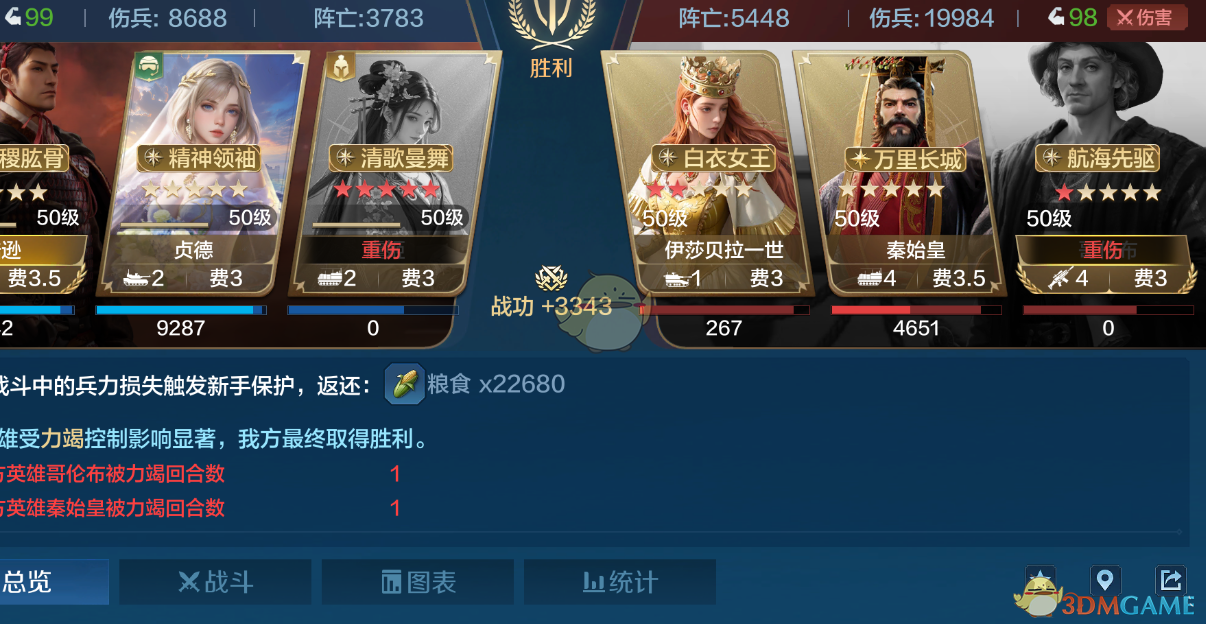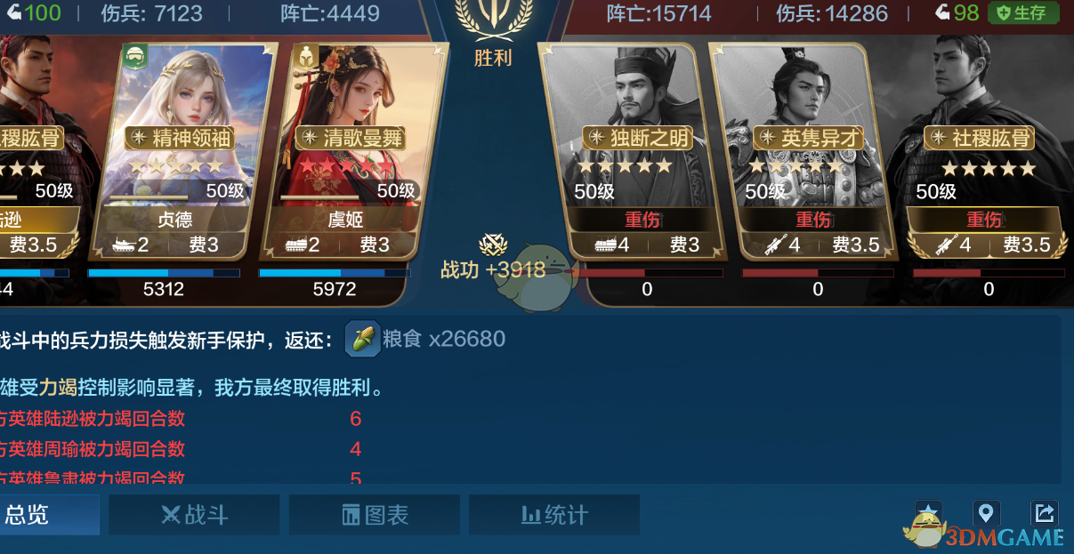 打高红反击队陆逊也是爆发非常高的伤害,锐不可当可以提供智力穿透在打这种肉队时可以更好打出伤害,而且也有着自我缴械的效果,这里扶正是第五回合才发动所以战损略高后面我多打了几次扶正只要前几回合发动了基本是无损打过反击队