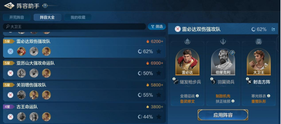 在搭配方面,比较多的选择是相对体系独立的坦克,比如给大卫王,其自身自带技能坦度很高,泛用性高;织田信长,其削弱流叠加后,坦度不差,搭配输出也很合适。