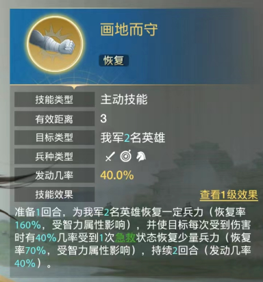 画地为牢,主动技能,有效距离3,发动几率40%,效果是为我军2名英雄恢复一定兵力,并且有几率受伤时得到一次急救效果。