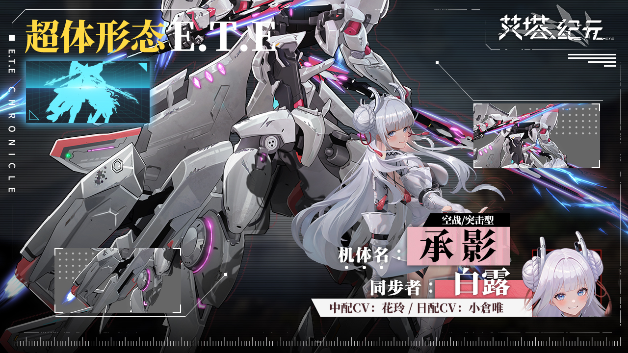 以「天璇」机体为基础进行核心重构的艾塔超体形态,与同代机体一样具备可变形设计。为了尽可能发挥白露的战斗能力,专门增强了低速回转性能和短距冲刺能力,是一台十分擅长攻坚战的机体。随着白露在前辈们指导下的不断成长,「承影」也一定会逐渐展露锋芒、成为第九协约新的王牌。