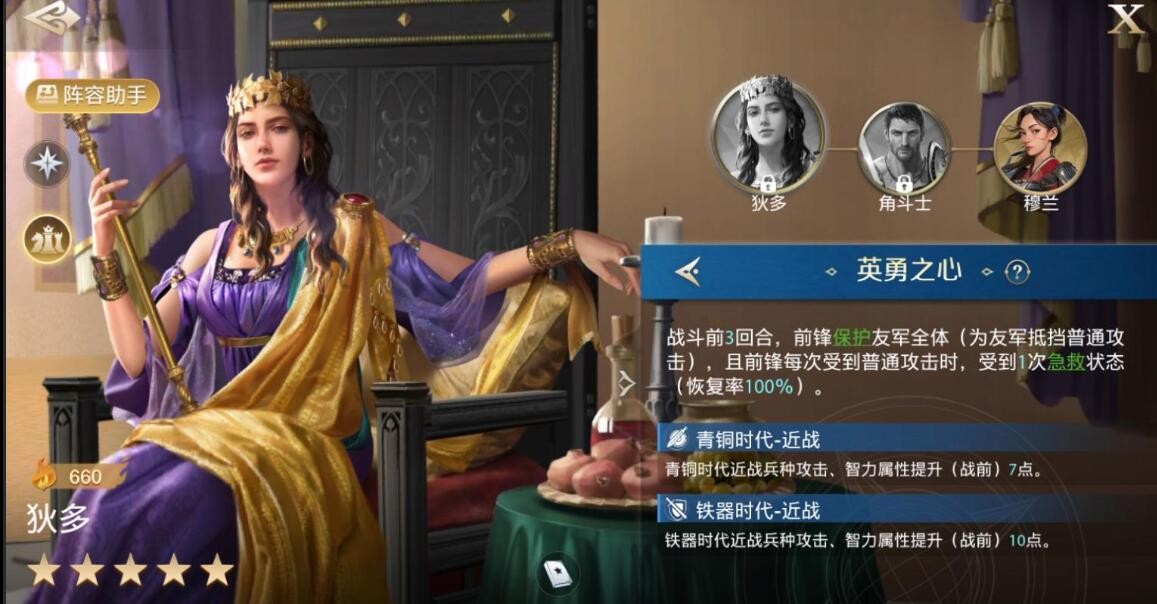 狄多的专属技能为建城者(有效距离5),敌军全体每个英雄造成6次伤害后,对其造成的主动技能攻击伤害大幅降低,持续2回合;而且在开场前4回合,使我军前锋英雄受到的攻击伤害降低20%。