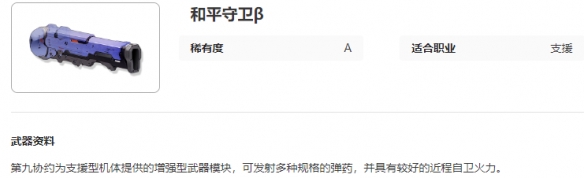 艾塔纪元和平守卫β图鉴介绍,第九协约为支援型机体提供的增强型武器模块,可发射多种规格的弹药,并具有较好的近程自卫火力的武器,下面小编给大家带来艾塔纪元和平守卫β图鉴介绍,有需要的小伙伴一起来看看吧。