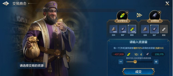 比如交易商会中资源置换并非无限的且会有一定比例亏损,但玩家每天都有一定的免税额度,支持1比1无损兑换。