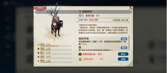 羽翼骑兵:费用为3、攻击:2.15、防御:1.25、敏捷:1.35
