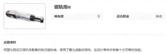 《艾塔纪元》磁轨炮α图鉴介绍,同盟为现役艾塔机体配备的制式磁轨炮,使用了最为成熟的架构,在设计寿命内有着十分可靠的性能的武器,下面小编给大家带来艾塔纪元磁轨炮α图鉴介绍,有需要的小伙伴一起来看看吧。