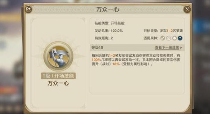 每回合随机1-2名友军尝试发动主动技能失败时,满级有100%的机率可再尝试发动一次,且本回合造成的首次伤害提升18%。