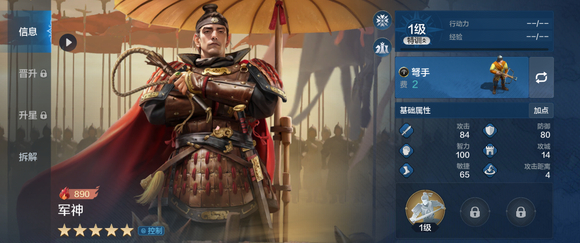 自带技能【兵权谋】:战斗开始后前3回合,使敌军2名英雄处于控制状态时受到的伤害提升15%(受智力属性影响),且从第3个回合起陷入混乱状态(不可驱散),持续2回合。