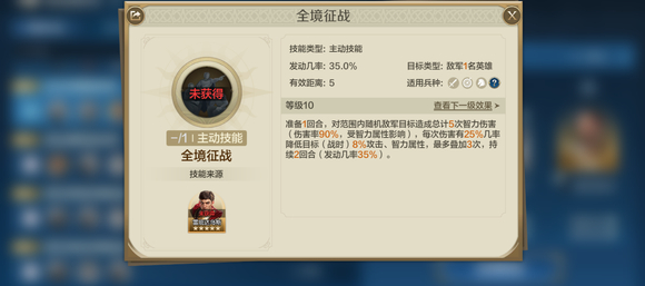 【全境征战】拥有35%的发动几率,能对敌军随机目标造成总计5次高智力伤害。这一技能不仅能在战斗中频繁发动,造成大量伤害,还能通过军神的智力属性进一步提升伤害效果;【决水千仞】技能可以增强敌军所受伤害,效果持续三回合,显著提升友军输出。结合【全境征战】的削弱效果,军神能够进一步强化友军攻击力,使敌军在战斗中处于劣势。