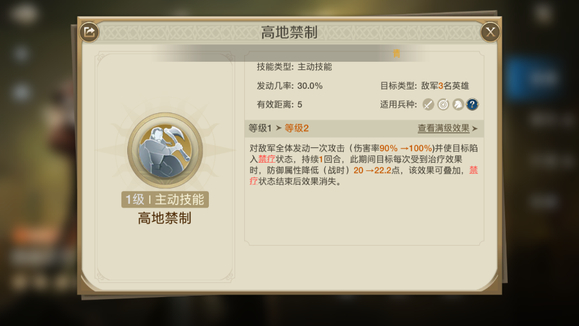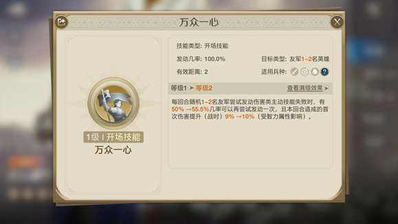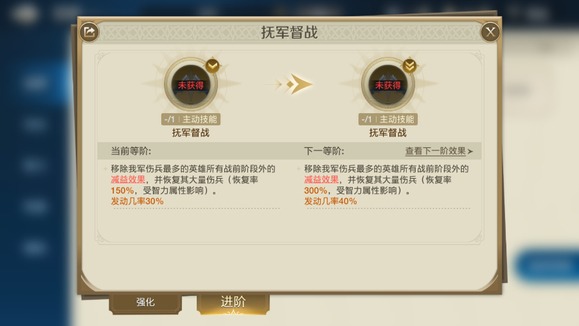 抚军督战:移除我军伤兵最多的单位受到的所有战前阶段外的减益效果,并且恢复大量伤兵。是一个不错的治疗技能。