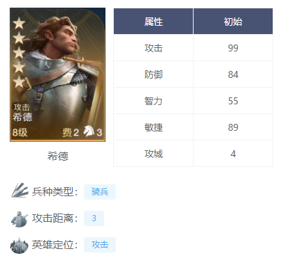 守护之剑:可以让战斗开始前后4回合获取霸体状态,位于前锋位还有几率移除减益效果,同时能提升我军统帅位置英雄的攻击和智力属性。刚好可以弥补希德防御能力不足的问题,让其可以存活更久。
