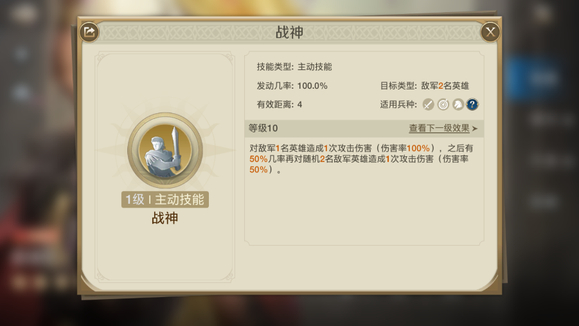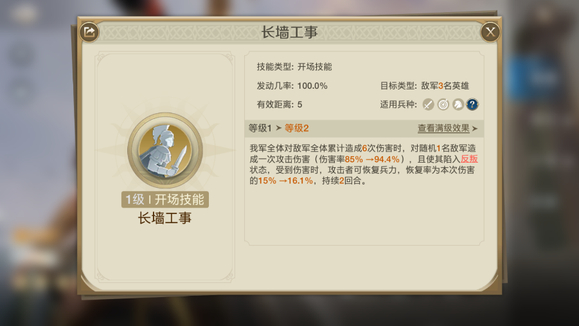 自带技能【战神】对敌军造成1次伤害,随后有几率再对两名敌军造成伤害。 不仅可以打输出,还可以加快【长墙工事】的触发。