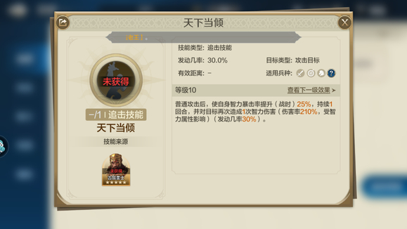 天下当倾:单体智力伤害,还可以再打一次,造成追击伤害