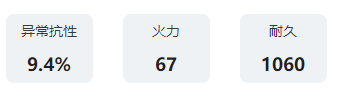 初始EN+100;受到范围伤害时,有25%概率为我方全体附加伤害吸收护盾,护盾值为各自耐久上限的30.4%,持续15秒,每波战斗仅能成功触发2次。