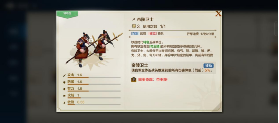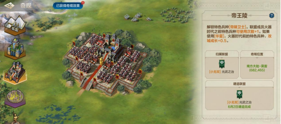 拥有“帝王陵”的联盟,其联盟成员将解锁特殊兵种“帝陵卫士”,火器时代之前特色兵种可使用次数+1。