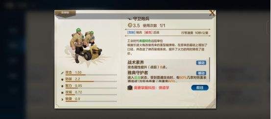 最后是古希腊专属特色兵种“守卫炮兵”,它比其他两位要高0.5费用,面板综合数值最高,是专攻防守反击的防御型兵种,对坦度与输出兼顾的前锋非常适合。