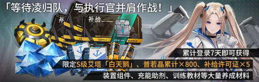 1、累计登录7天即可获得限定S级艾塔「白天鹅」、普若晶累计×800、补给许可证×5。