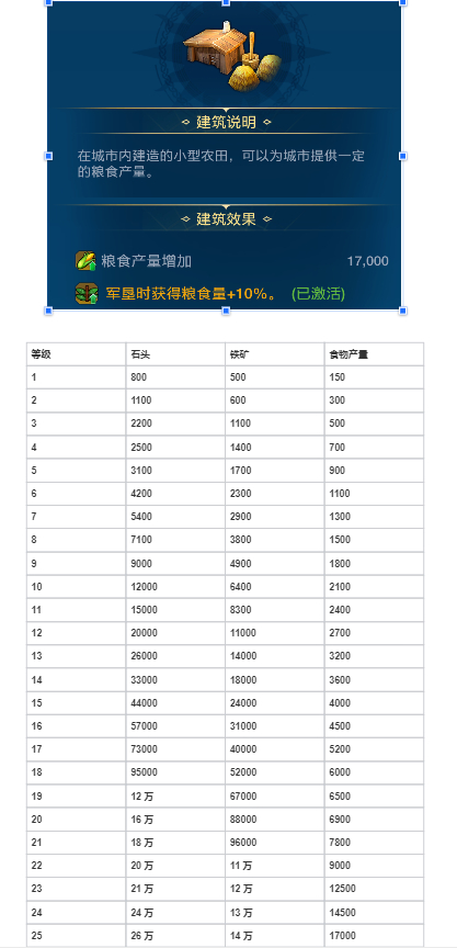 建筑农田能为我们增加食物产量,还能提高军垦时获得的产量(随着农田等级提升而提升)。