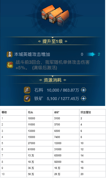 能够使本城英雄攻击增加,还能使我军随机单体攻击伤害提高5%