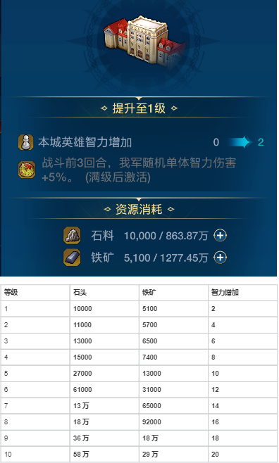 提高本城英雄的智力,战斗前3回合,我军随机单体智力伤害提高5%