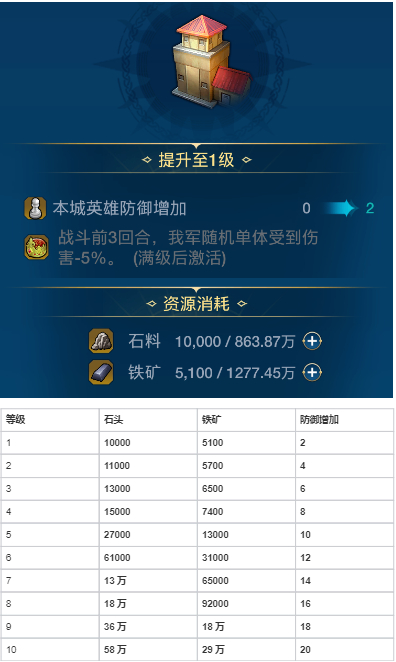 可以让本城英雄防御增加,战斗开始时受到的伤害降低5%