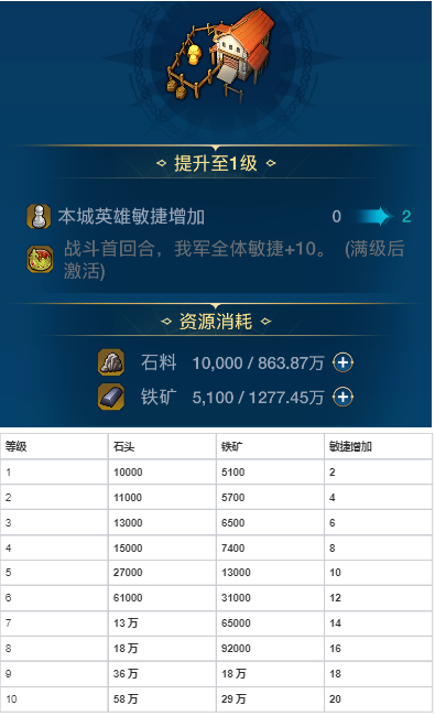 可以提高本城英雄的敏捷属性,战斗首回合我军全体敏捷+10