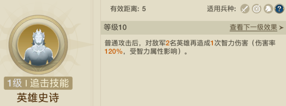 再来看一下吉加美士的技能,乍一看是非常普通的追击类技能,甚至不如一些四星的追击技能。但是其实是普通攻击后对敌方“两名”英雄造成智力伤害,可以理解为普攻后接一次AOE,如果换算下来伤害率其实有240%,比斯基泰女王还高出10%,而且吉加美士的属性比斯基泰女王还高不少,非常强力的追击技能。
