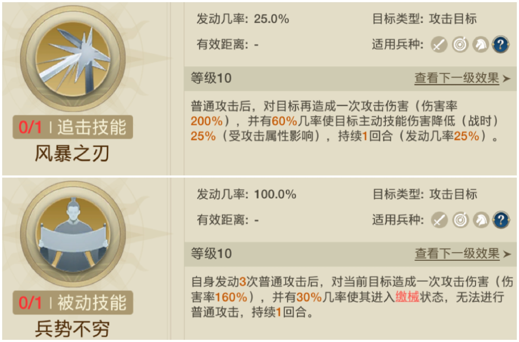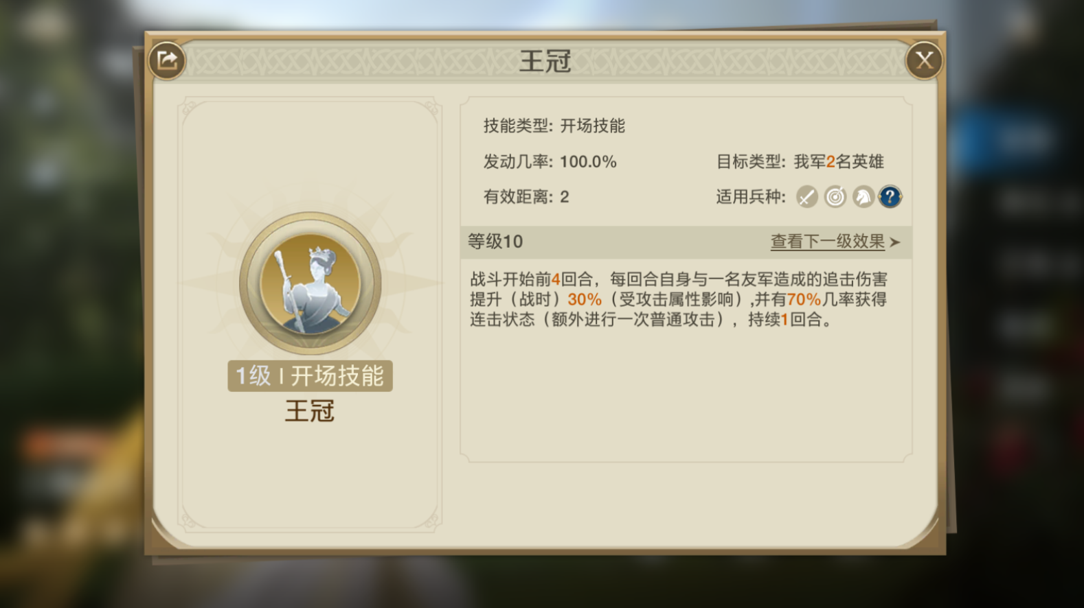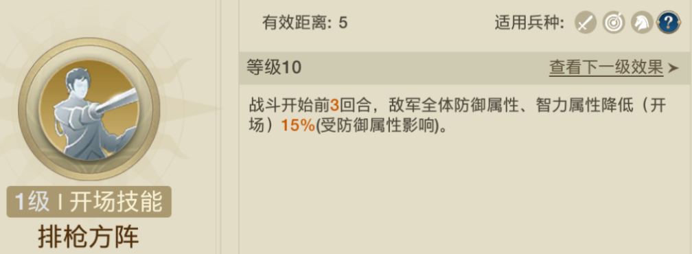 自己的技能“排枪方阵”则是降低敌方前三回合的防御强度。配合上三狮女王的自带技能“王冠”,我们将战斗的胜败全部放于前三回合上。不是敌死就是我亡!