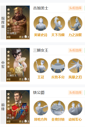 这套阵容的选取搭配吉加美士的英雄上,这里选择的是三狮女王和铁公爵。