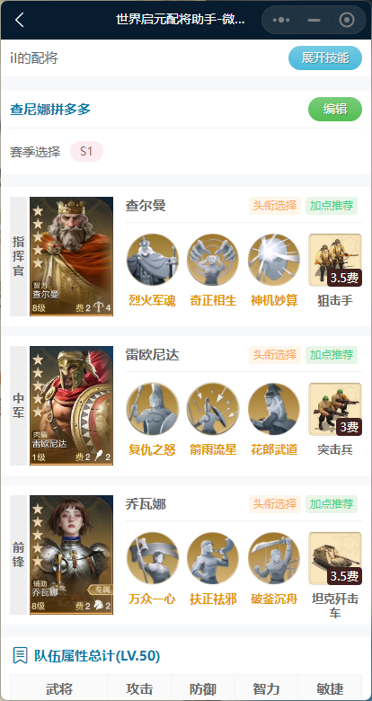 查尔曼的烈火军魂和这里带的奇正相生都可以带来减益效果,同时伤害很高,能够配合雷欧尼达的花郎武道打伤害;这里的奇正相生换成其他主动控制技能也可以。雷欧尼达则带箭雨流星+花郎武道,前者造成负伤且无需准备,后者如果目标有减益效果则再造成一次伤害,输出很高。乔瓦娜则是带两个解控,这里带常规的全境封锁+制敌机先也可以。