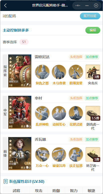 这里雷欧尼达的配招改为木马奇袭+箭雨流星。木马奇袭是目标如有负伤(负伤也是减益的一种)有概率再造成一次伤害,同样能形成combo。幸村则带动摇军心+花郎武道,前者是一个主动控制技能,控制也是减益的一种;后者如果目标有减益效果则再造成一次伤害,输出很高。乔瓦娜携带两个主动解控技能,配合幸村的自带技能造成控制。