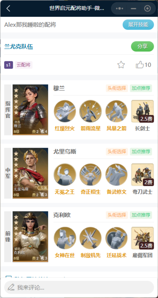 在大河赠礼和红颜两边都凑不齐时,可以考虑穆兰、尤里乌斯和克利欧的混搭。思路是尤里乌斯带奇正相生+备武修文,给队友上奶,给对手上debuff;穆兰带箭雨流星+风暴之刃,配合对面的debuff打伤害;克利欧可以带制敌机先、迁延战术、避实击虚、全境封锁中的其中两个,当辅助。
