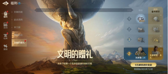 新福利,只要任意充值均可获得时代货币,在不同文明时可消耗货币领取不同阶段的奖励,奖励给得很丰厚。
