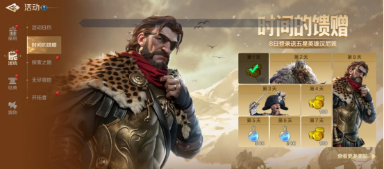老活动“时间的馈赠”,前8天的奖励最超值,可累计获得3个五星英雄,并且他们是能组成带有命运羁绊的强力体系队,往后签到汇总还有金币、银币、抽卡资源等。