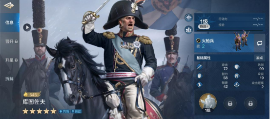 库图佐夫率领的兵种是近战,攻击距离一般,只有2,定位是肉盾与辅助。面板属性也非常优秀,初始防御属性为99,攻击为72。