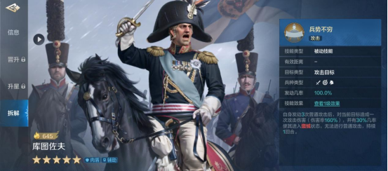 技能搭配上,库图佐夫可以带回血及防御类技能,如“重整队形”“破釜沉舟”等等,以提升坦度为主。