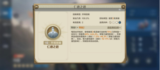 每回合开始时,使得我军2名英雄行动时有75%几率回复一定兵力(回复率40%【满级80%】,受智力属性影响),并使其造成的伤害提升(战时)7.5%【满级15%】(受智力属性影响),攻击、智力属性提升(战时)10点(满级20点,受智力属性影响),持续到本回合结束。