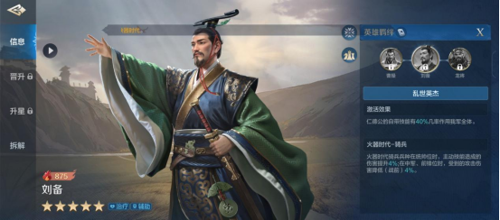 刘备的攻击距离为2,率领的兵种为近战,定位是辅助/治疗。刘备的面板可以说在五星中是一般,也就初始智力87能看,但整体比较均衡,没什么大短板。