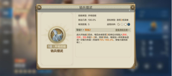 自带技能“销兵偃武”是其核心能力:战斗开始前2回合,每回合使敌军2名单位分别陷入缴械、超模、混乱中的1~2种,持续1回合,每施加一种效果会造成一次智力伤害(伤害率75%)(满级150%)(受智力属性影响)。
