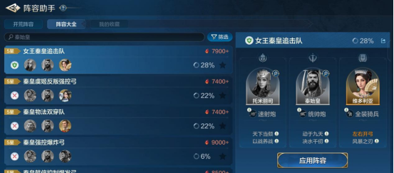 其次秦始皇可以加入任意体系队伍,成为强控输出手,如追击队伍选择“托米丽司+秦始皇+维多利亚”,或者“白起+秦始皇+虞姬”,强化其阵容控制能力,二者强度都很稳定。