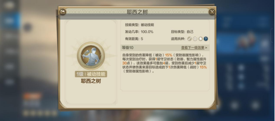 自身受到的伤害降低(被动)15%(受防御属性影响),每次受到治疗时,获得一层守卫状态(防御,智力属性提升30点),该效果最多可叠加4层,受到伤害后减少1层守卫状态并使伤害来源目标造成的下一次伤害降低(战时)15%(受防御属性影响)。