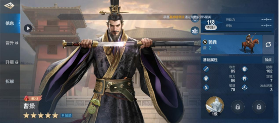 曹操率兵的兵种是骑兵,攻击距离为3,定位是辅助。面板方面非常优秀,初始101防御与96智力名列前茅,同时攻击也不低,有89点。
