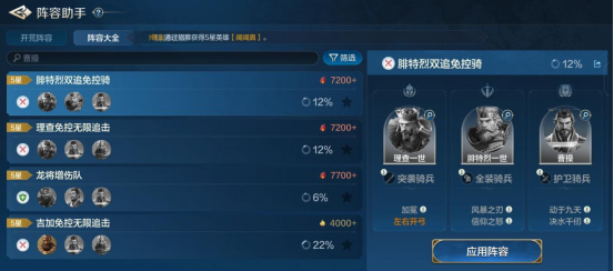不过,遇事不决还是首推命运羁绊阵容“曹操+刘备+龙将”,虽然比较难凑,但强度确实在线。其次就是找以同为骑兵兵种的武将组免控队,如“理查一世+腓特烈一世+曹操”等等,都是不错的选择。