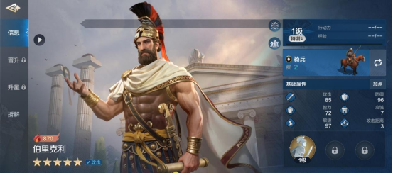 伯里克利的攻击距离为3,率领的兵种为骑兵,定位是攻击。就面板来说,初始防御与敏捷为96、97,伯里克利可像是防御英雄。