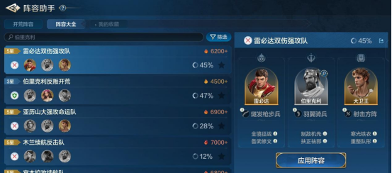 阵容搭配方面,伯里克利阵容最好可以有稳定的输出频率,因此能稳定每回合输出的“雷必达”与“亚历山大”是其最佳拍档。