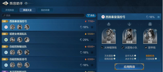 搭配方面,西施基本必定加入控制队,最好的选择秦始皇体系,无论是“秦始皇”“白起”“蒙恬”都是强力的控制武将,能让队伍的控制拉满。