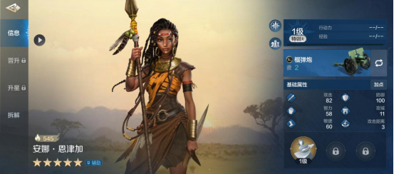 安娜·恩津加率领的兵种是远程兵种,攻击距离为3,定位是辅助。面板数值方面突出,初始攻击82,初始防御100,身板相当硬。