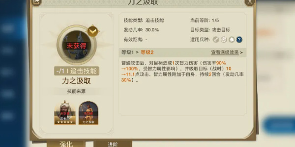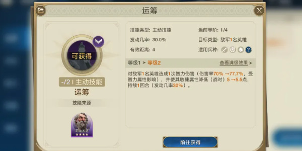 2技能前期我们用运筹来过渡,也是1个单体伤害(伤害率70%-77.7%,还能使得敌方敏捷属性降低5-5.5点)持续1回合。不错的单体技能,还能降低属性。