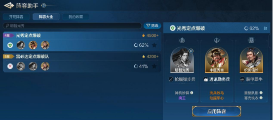 让明智光秀当主C的话,那么命运羁绊阵容是一个不错的选择。若副C,那么基本是“织田信长”或“图特三世”+明智光秀+智力输出,这里智力输出英雄的选择很多,控制流、续航强的优先,爆发、追击靠后,官方阵容搭配推荐了“雷必达”就很契合。