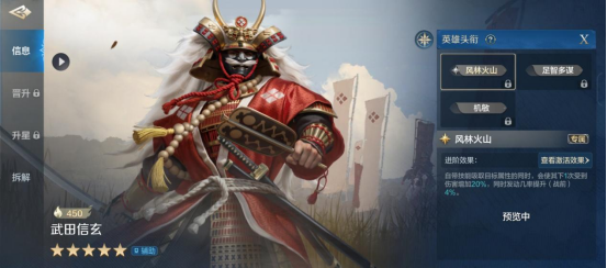搭配方面,全能力智属性加成让武田信玄的就业空间非常不错,甚至可以辅助“关羽”“刘备”这样顶级英雄,加入一线搭配。
