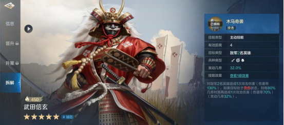 武田信玄率领的兵种类型是远程,定位是辅助,攻击距离为3。面板数值方面,初始智力91,智力算是中上。此外,防御与攻击也有70+,普攻与身板都不算差。